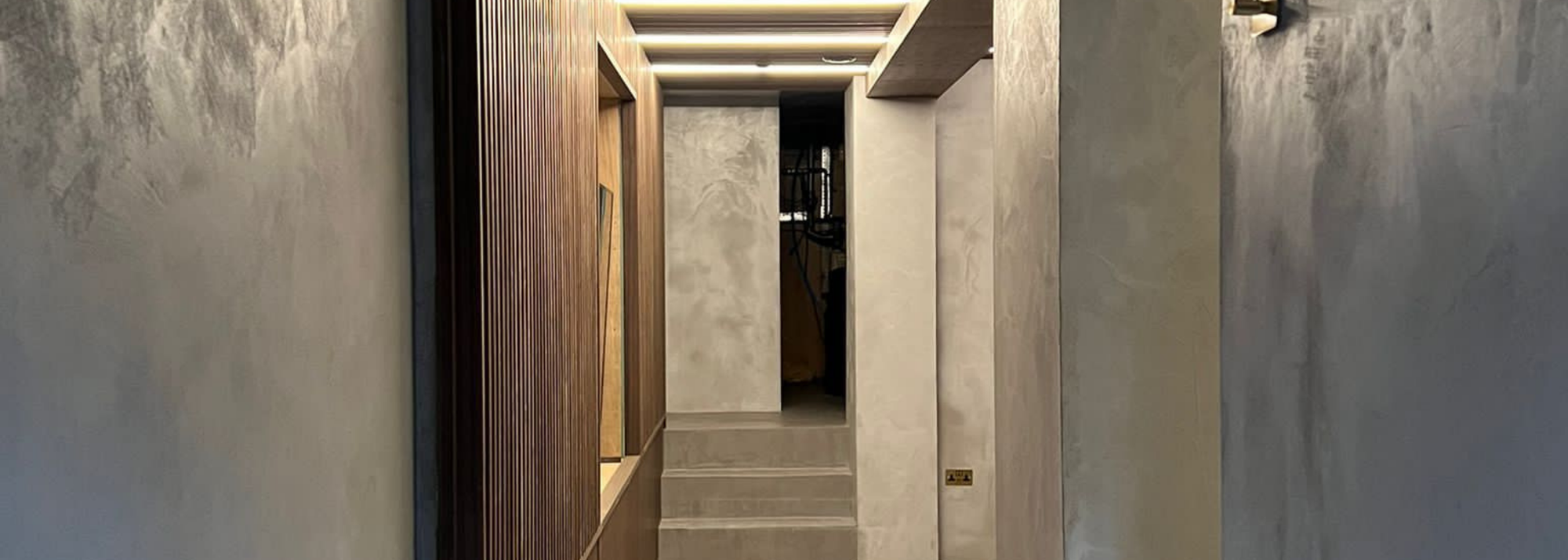 Plastered walls including skimmed plasterboard walls are perfect for microcement. Obviously they should be smooth and free of any damage, dents etc.